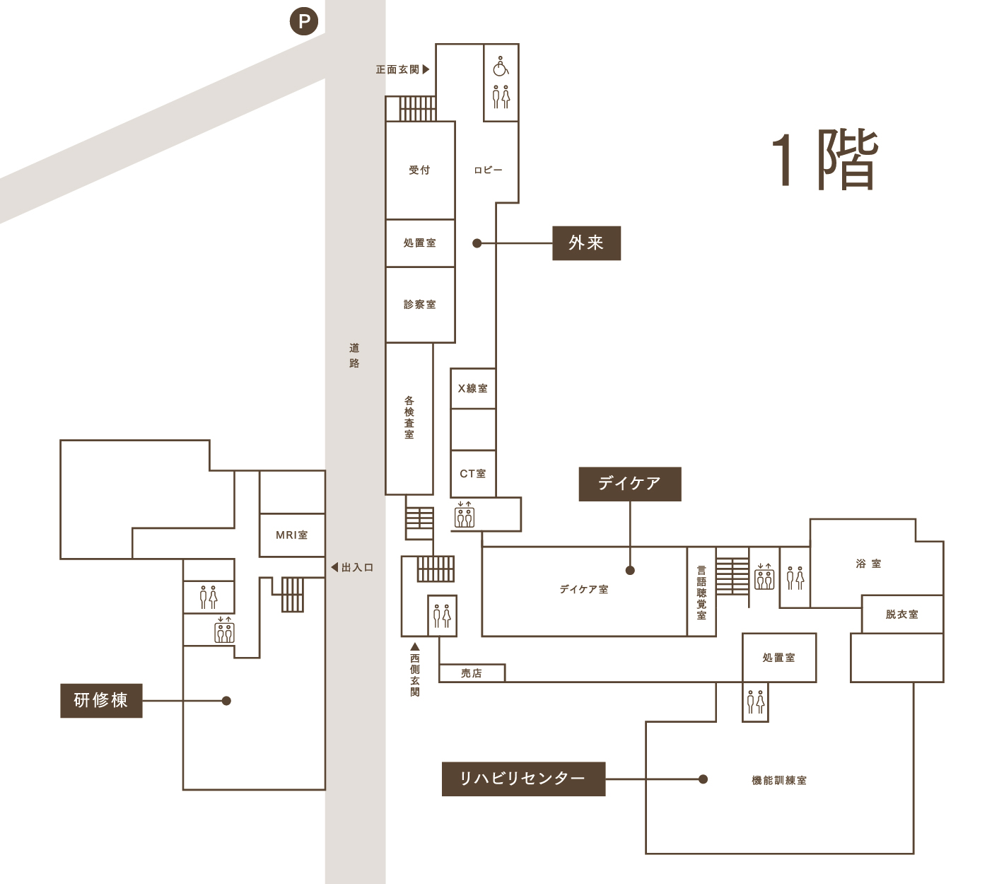 病棟(一般病棟・療養病棟・回復期リハビリテーション病棟) リハビリテーションセンター(理学療法室・作業療法室・機能回復訓練室・言語聴覚療法室) デイケアセンター (通所リハビリテーション) 浴室(リフト付介助浴・自立浴・シャワーベッド) その他 ( 管理棟・給食厨房・研修室・多目的ホール・売店・託児所) |